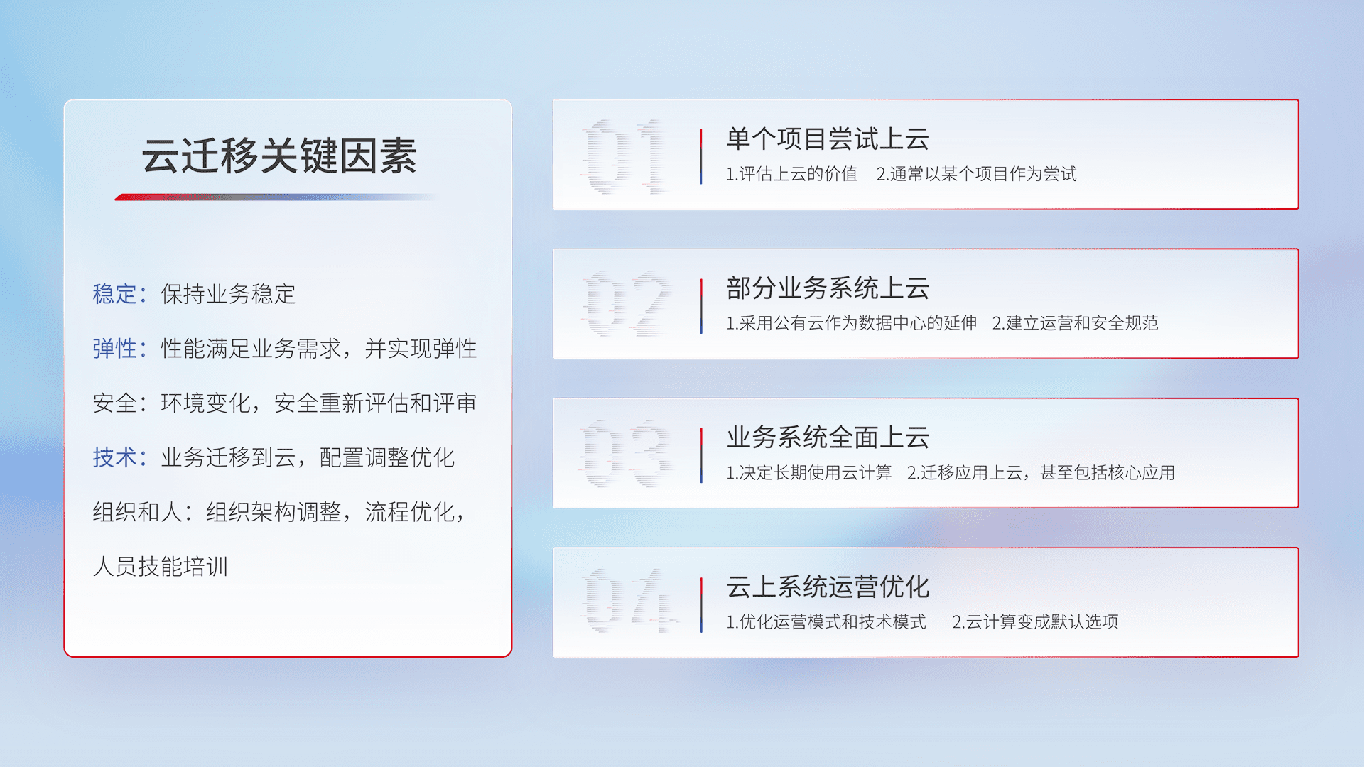 结合实际业务,,,从规划设计、、、云平台选型、、云原生改造、、、数据迁移、、、、集成交付,,迁移全过程为客户识别最佳上云路径,,,做好风险识别管理,,设计网络架构、、、、身份权限、、、安全审计合规、、、操作审计、、、、日志审计、、监控告警策略、、多站点容灾设计等,,对云上基础设施进行整体规划,,,,提升IT治理水平,,,以满足弹性、、高可用、、、高性能的需求。。。。