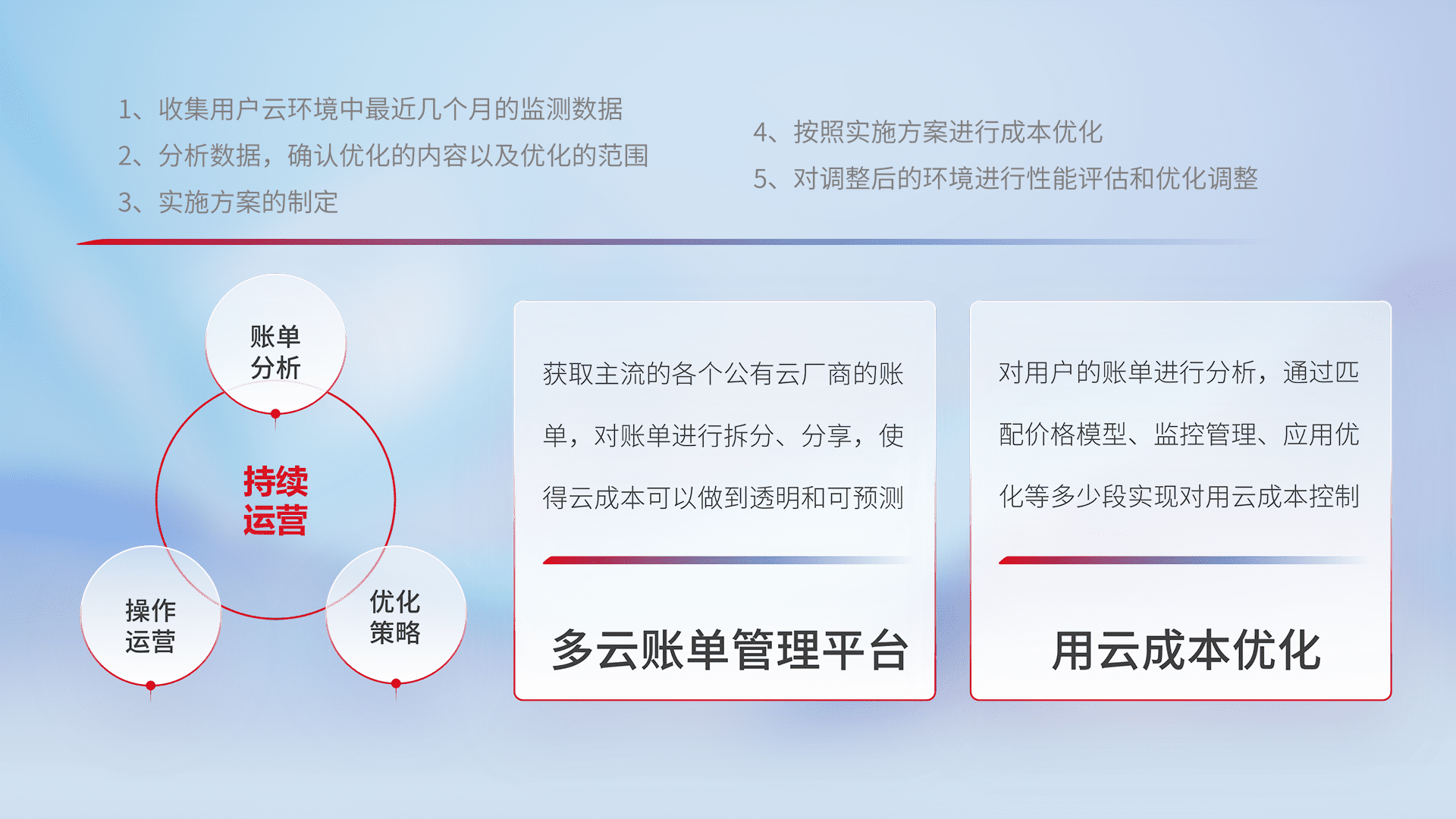通过多云纳管,,以统一的资源数据模型把客户的云资源进行抽象和封装,,进而实现对多云资源的统一操作,,,,保障云资源管理的可靠性、、稳定性与可用性。。。。量身定制化运维内容,,,,配置、、开发运维、、补丁管理、、备份、、、监控、、、、认证和访问管理、、、审计和日常巡检等,,,保障在用云过程中的可靠度,,,,稳定度以及高可用率。。。